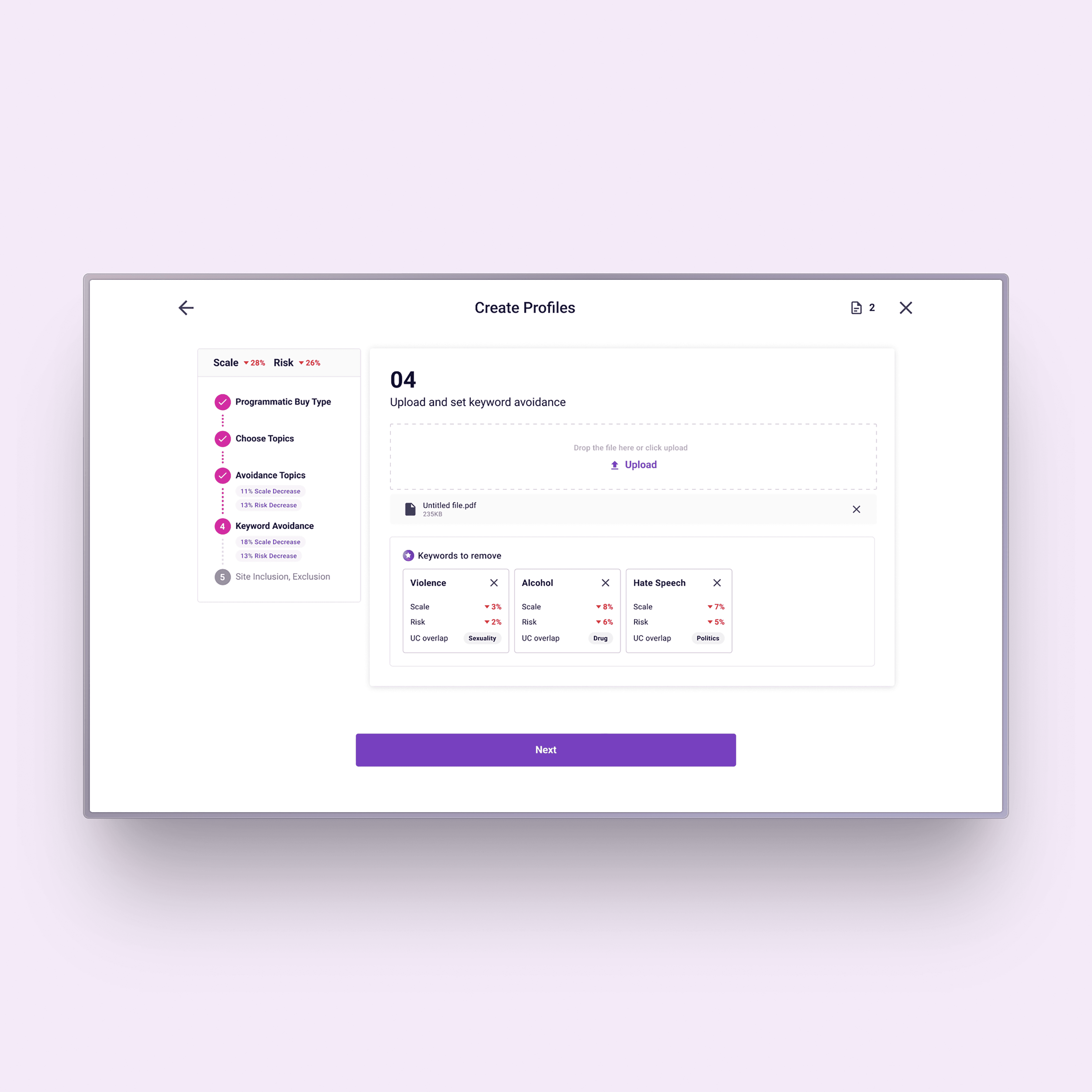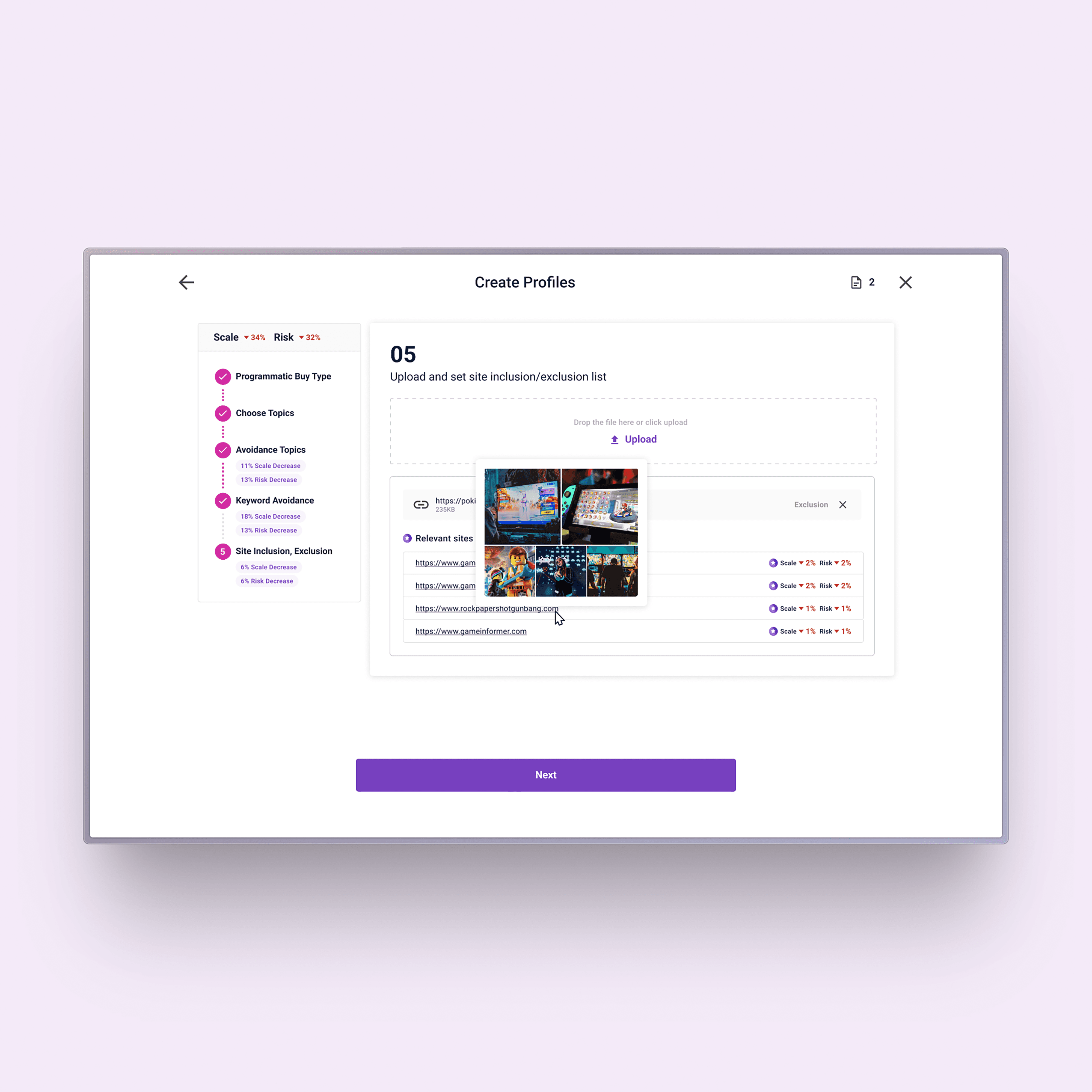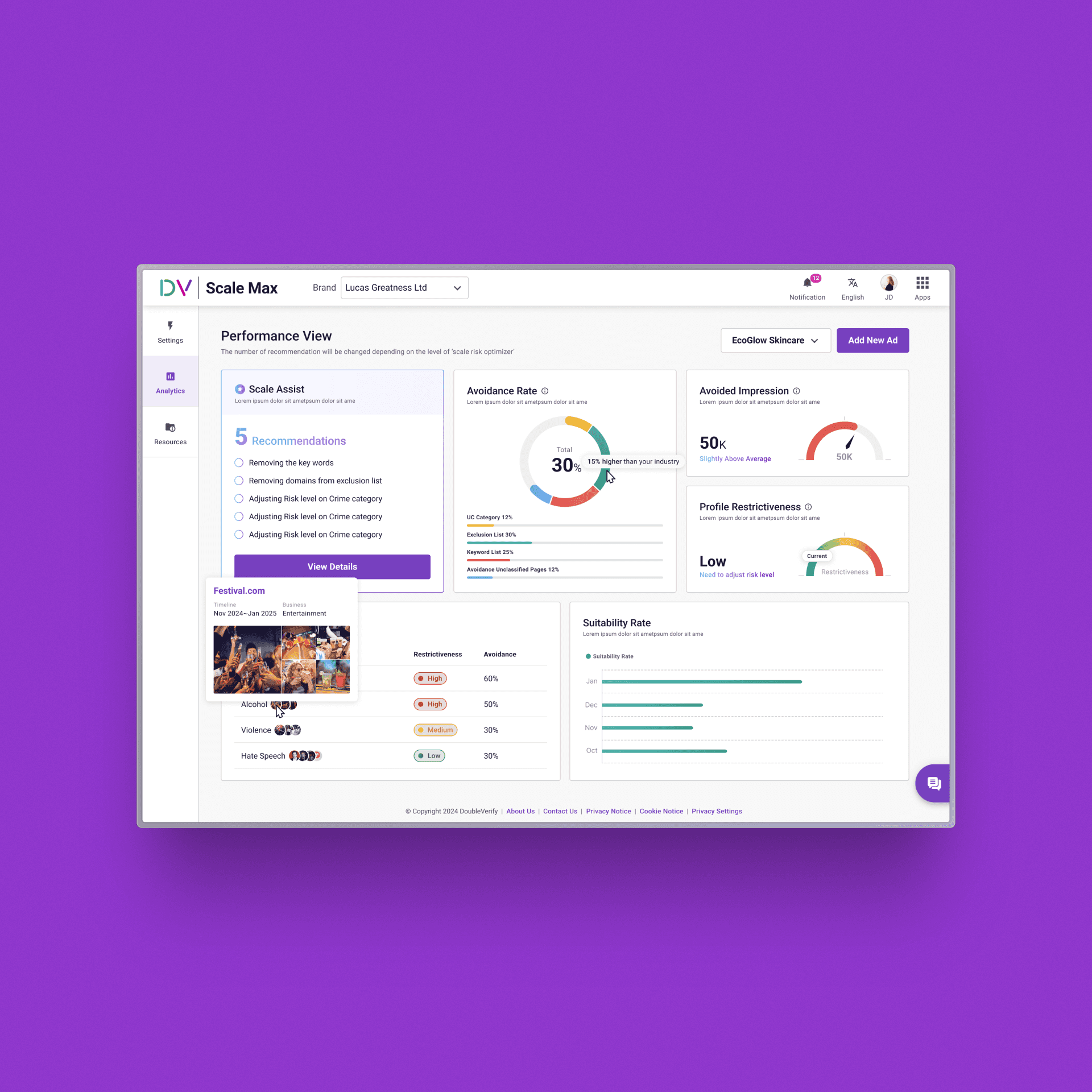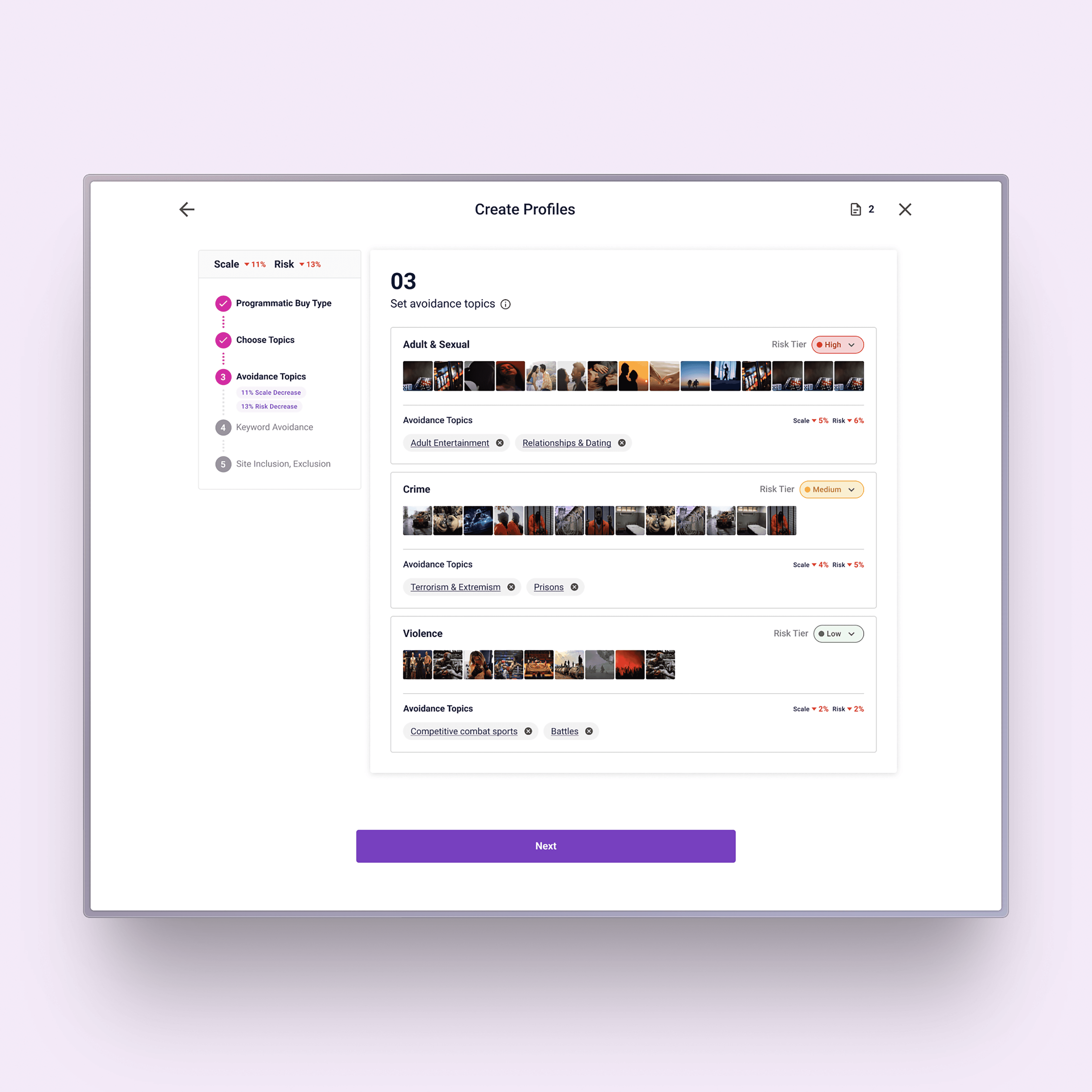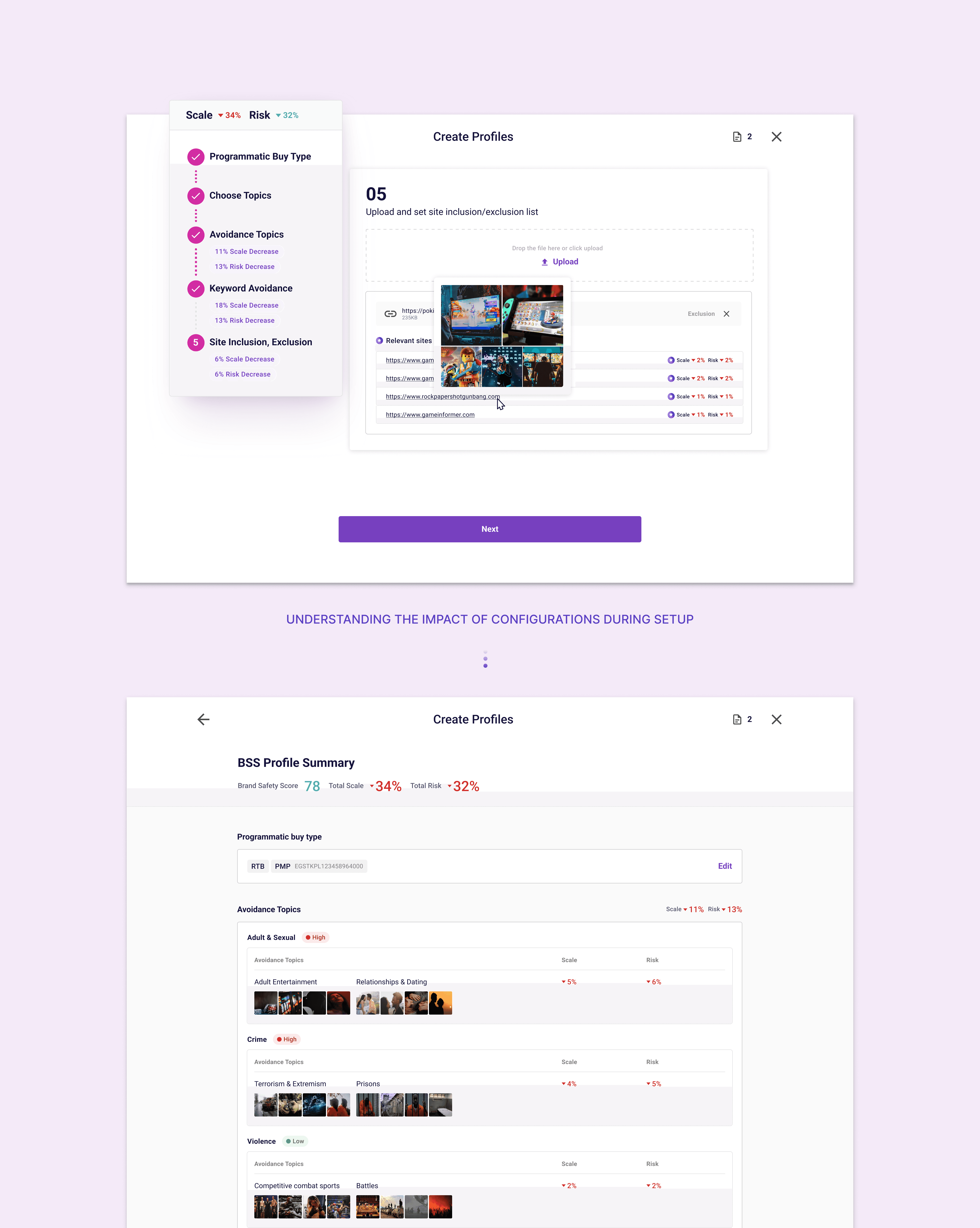 The guided setup helps advertisers configure brand suitability profiles with clear visibility into how each decision affects campaign performance. Instead of navigating complex settings in isolation, users are presented with key metrics—such as avoidance rate, suitability rate, and profile restrictiveness—alongside AI-driven recommendations.