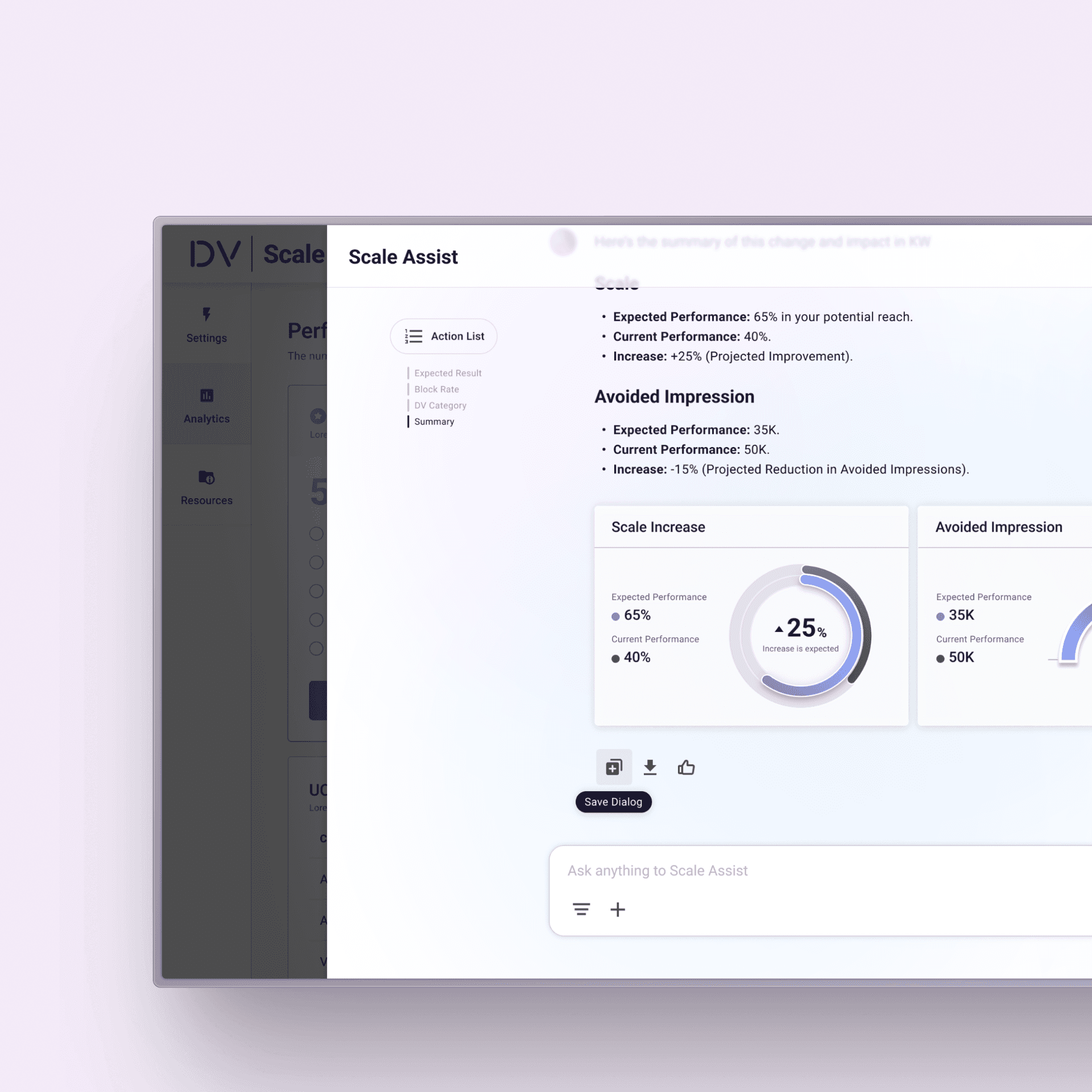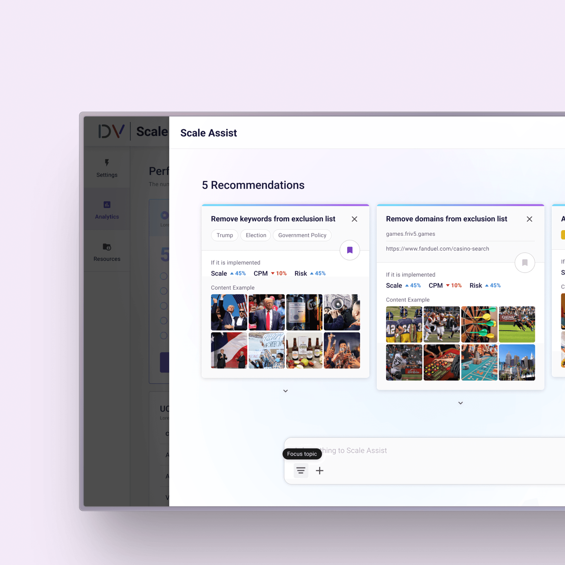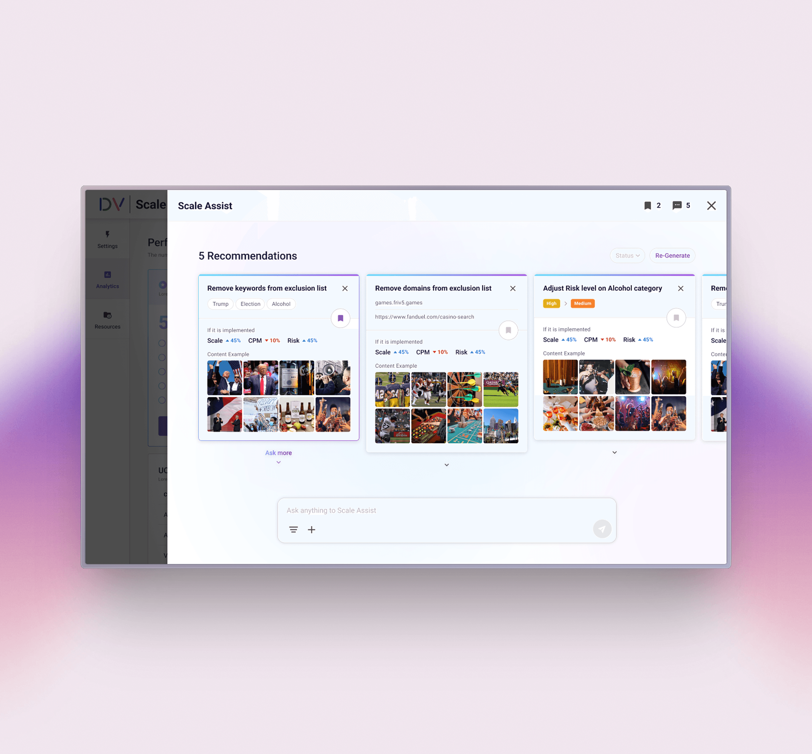 The Scale Optimizer surfaces AI-generated recommendations that help advertisers identify and remove overly restrictive settings. Each recommendation clearly communicates its expected impact on key metrics such as scale, block rate, and CPM.
