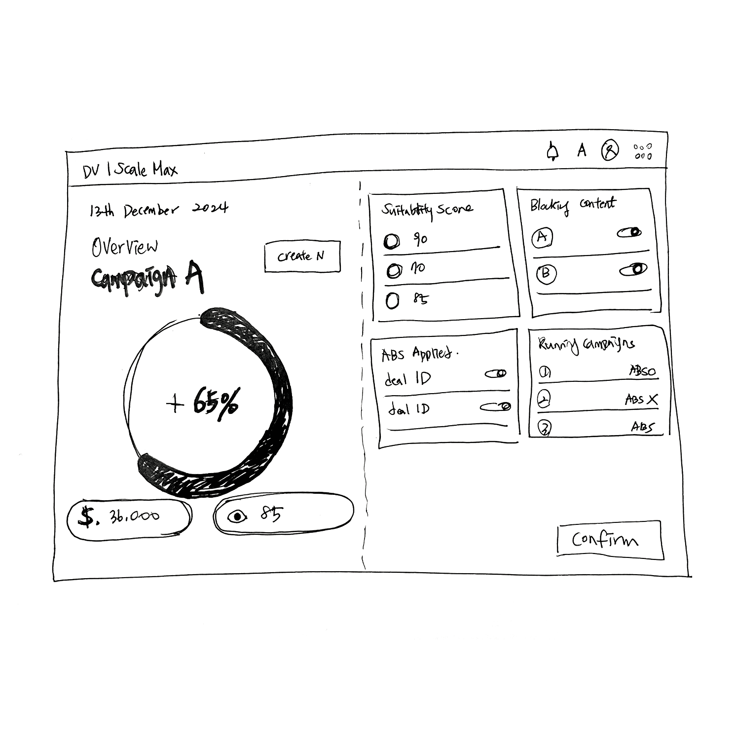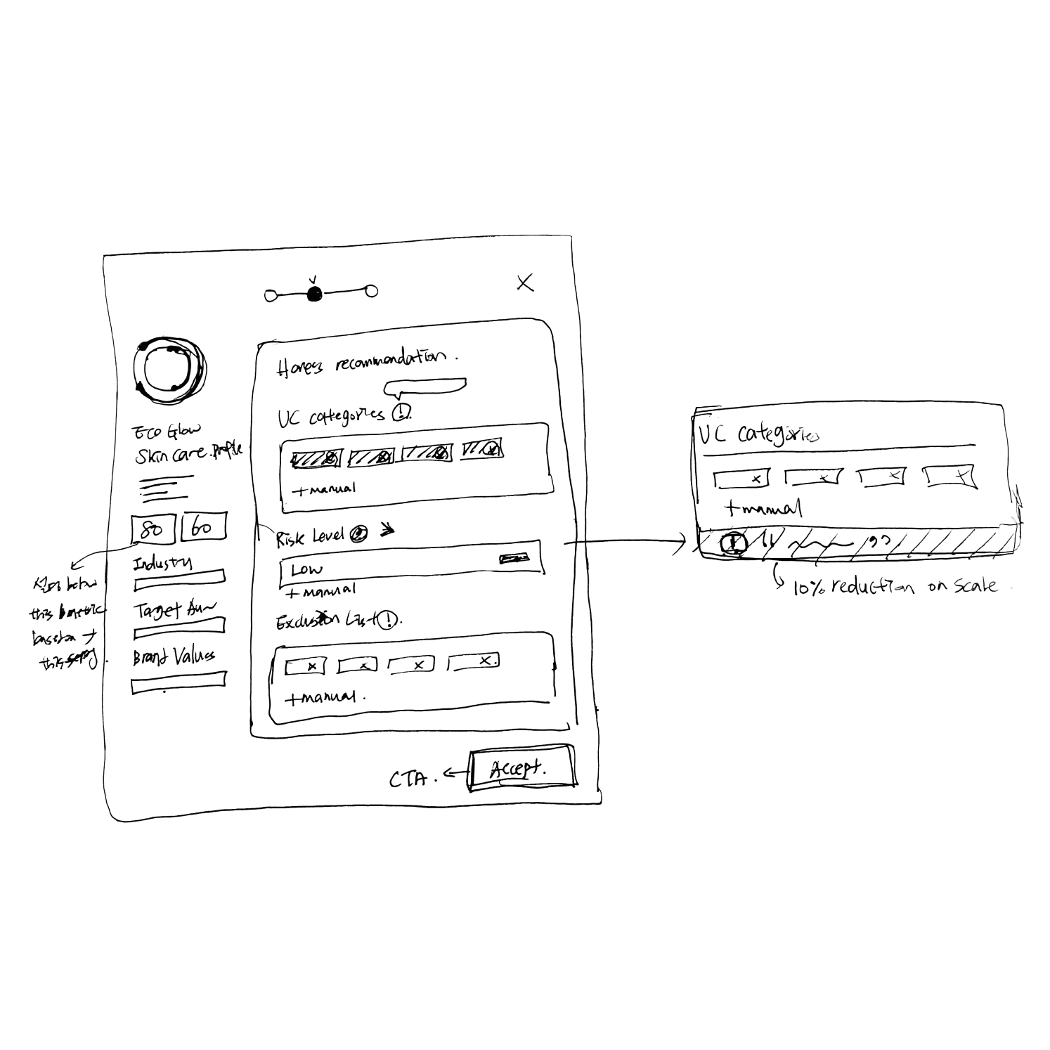 Early sketches explored two key action points in the workflow: a guided setup to help users configure brand safety profiles with awareness of scale impact, and a scale optimizer that surfaces recommendations to adjust restrictive settings. Together, these flows help advertisers understand the impact of their configurations and quickly take action to improve campaign scale and performance.