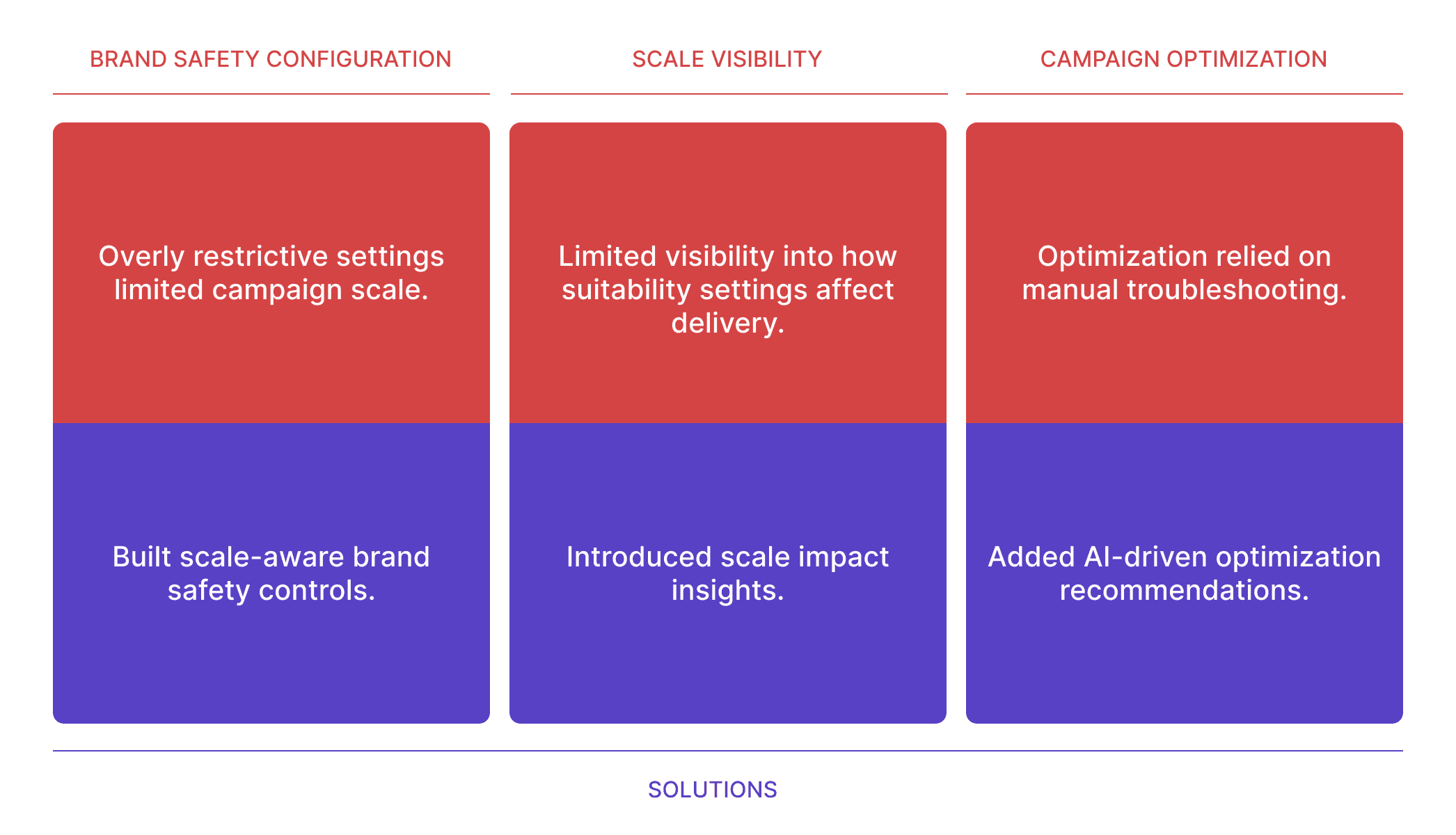 Based on client interviews with agencies and advertisers, we identified three core challenges: advertisers lacked visibility into how brand safety settings affected campaign scale, teams often applied overly restrictive configurations that unintentionally limited reach, and optimization relied heavily on manual troubleshooting rather than actionable insights.